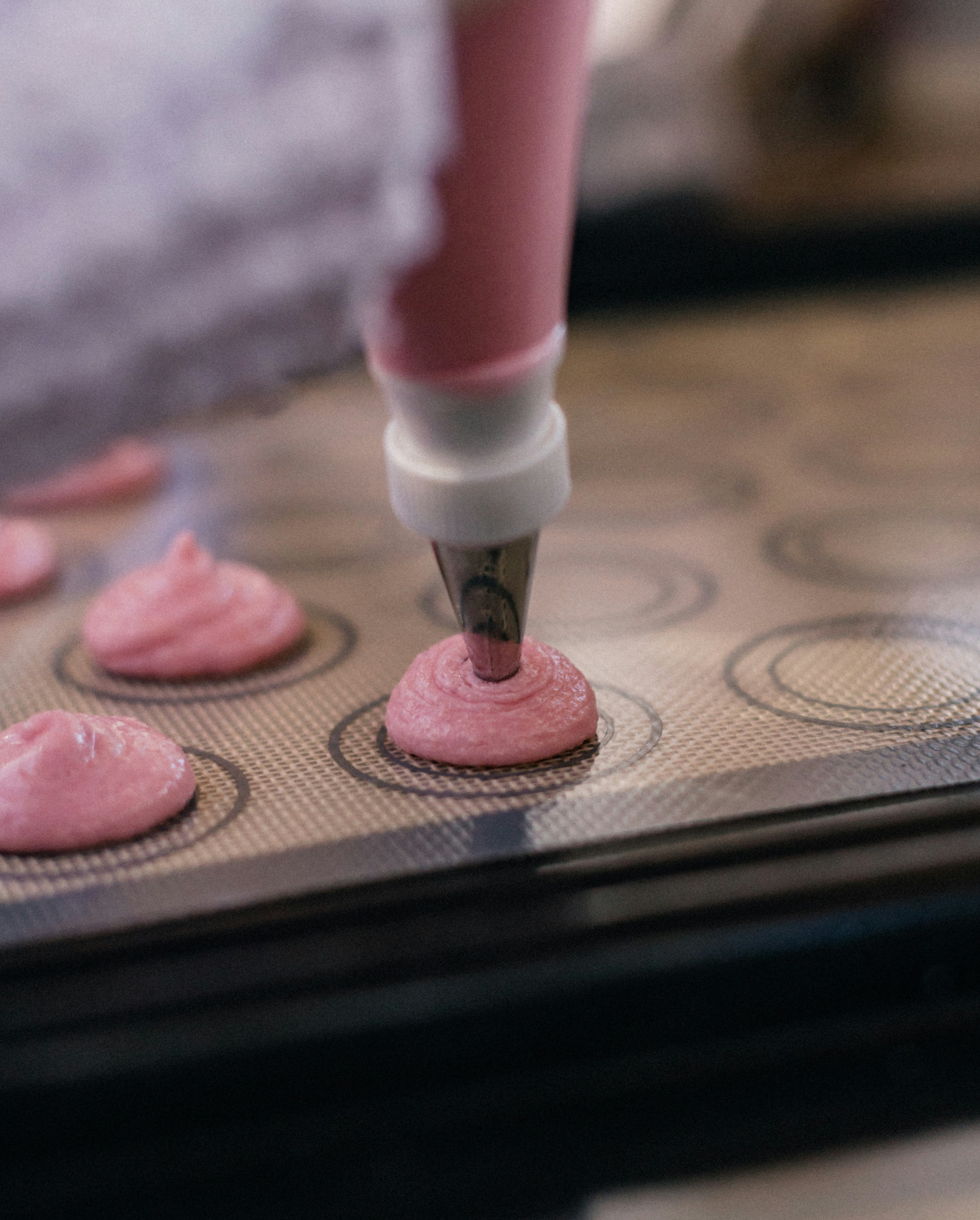 - 반죽을 짤주머니에 담아, 유산지를 깐 베이킹 트레이 위에 동그랗게 짜줍니다. 마카롱의 크기는 약 3cm가 적당하며, 균일한 크기로 짜야 구울 때 모양이 일정합니다.